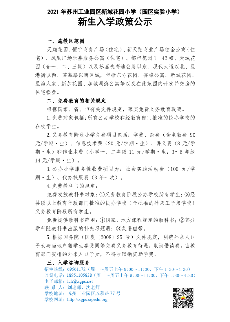 2021年苏州工业园区新城花园小学新生入学政策公示